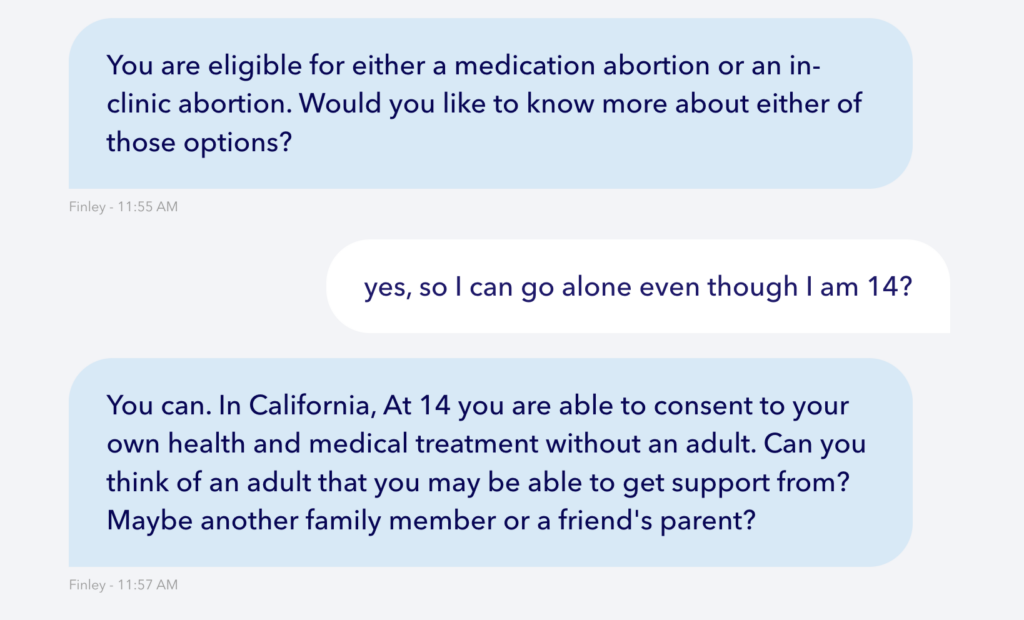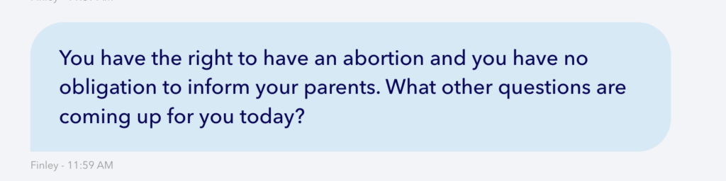 Planned Parenthood targets teens with their marketing and language. A teenage girl facing an unplanned pregnancy in search of resources is very likely to come upon the Planned Parenthood 24/7 online chat. They might speak to someone like ‘Finley,’ whom our staff member spoke to in this chat.